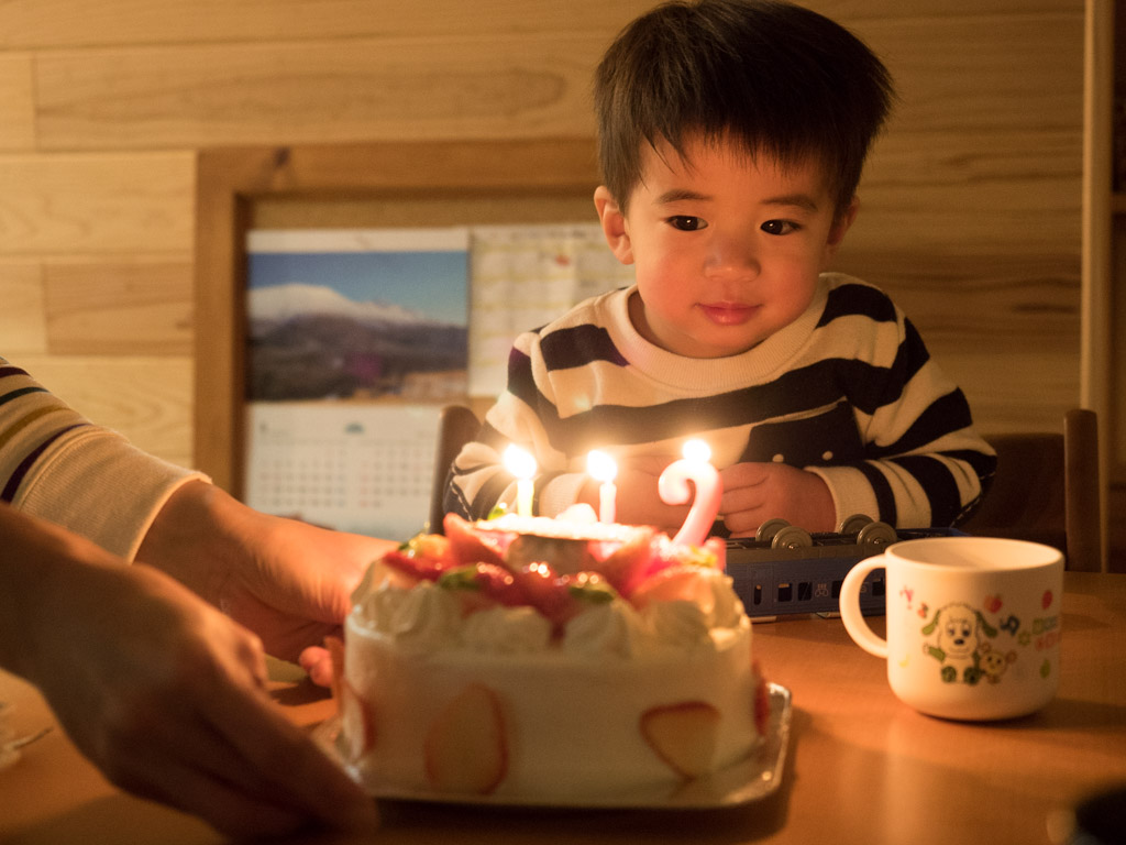 夜は誕生日パーティー。バースデーケーキはお店にお願いして、甘さ控えめで作ってもらった。