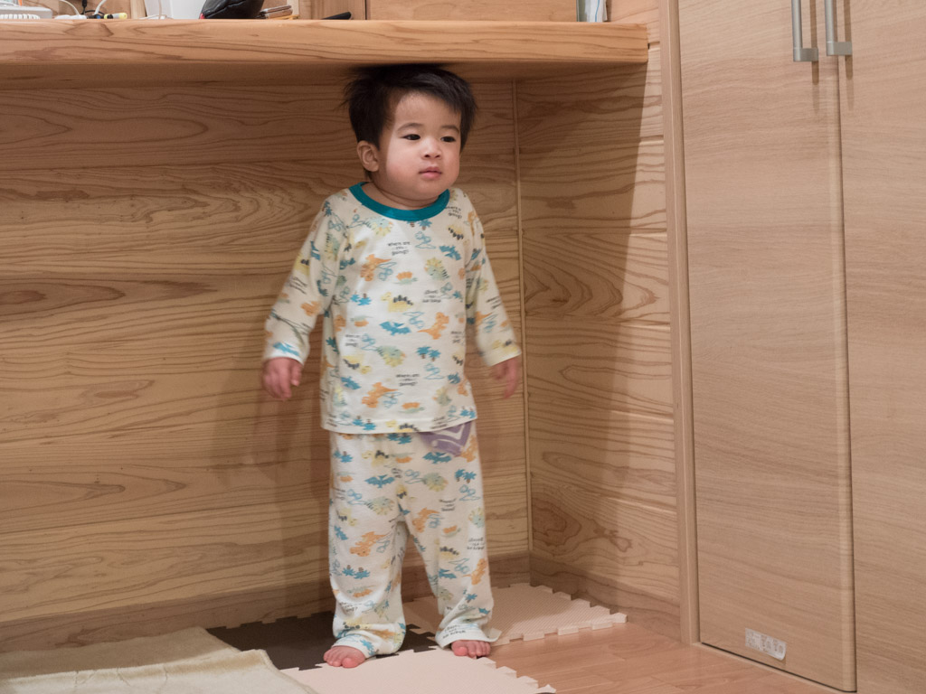 この間までカウンターの下を歩き回っていたのに、もう天井に頭がついた。