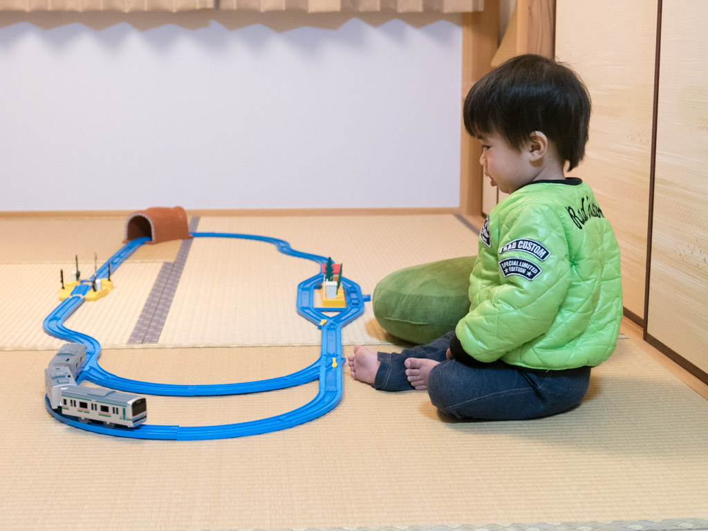 帰宅後、レールをつないで列車を走らすとこぶ大興奮。kehyにはこっぴどく怒られたけど、パパほっこりの一日だった。